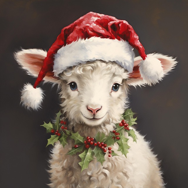 ai generated, lamb, sheep, hat, santa, holiday, animal, nature, cute, christmas