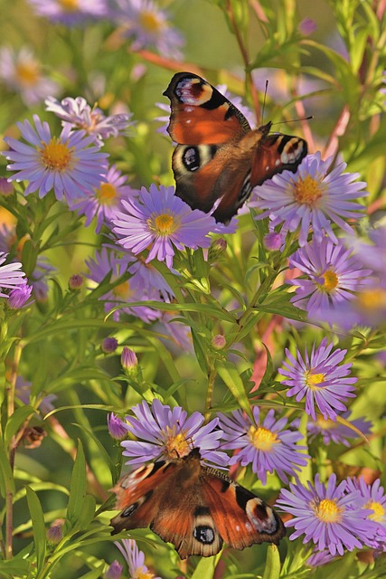 butterflies, peacock butterfly, herbstaster, blossoms, fall, nature, garden
