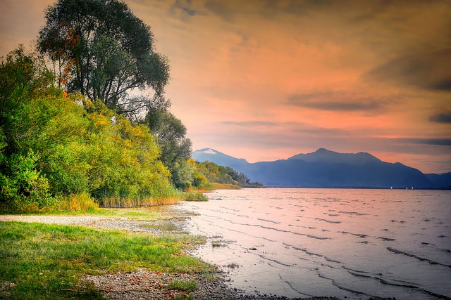 Duvet Covers: lake, trees, meadow, bank, mountains, bavaria, chiemgau, autumn, clouds, mirroring, twilight, gravel bank, grass, alpine, landscape
