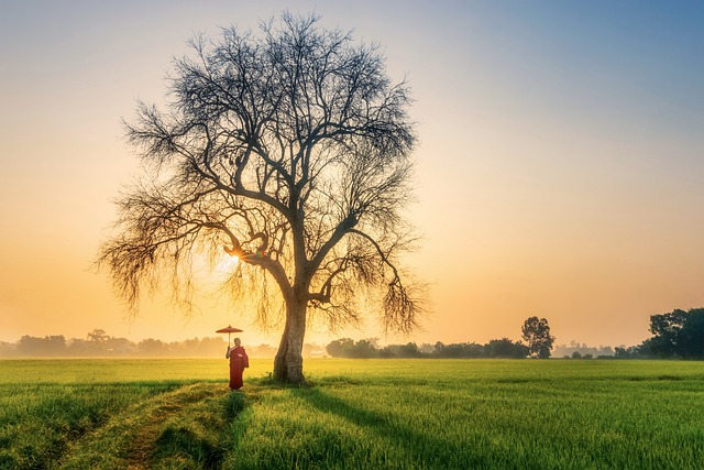 Duvet Covers: monk, morning, old tree, sun, countryside, sunstar, rice, green, tay ninh, viet nam, landscape
