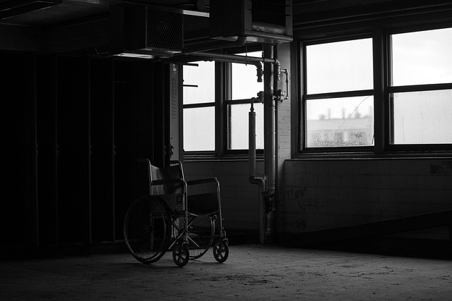 Metal Prints: abandoned hospital, wheelchair, abandoned room, monochrome, building, black and white