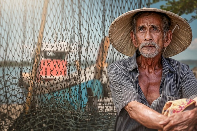 Metal Prints: fisherman, old man, net, senior, elderly, aged, man, conical hat, job, work, sitting, pose, portrait
