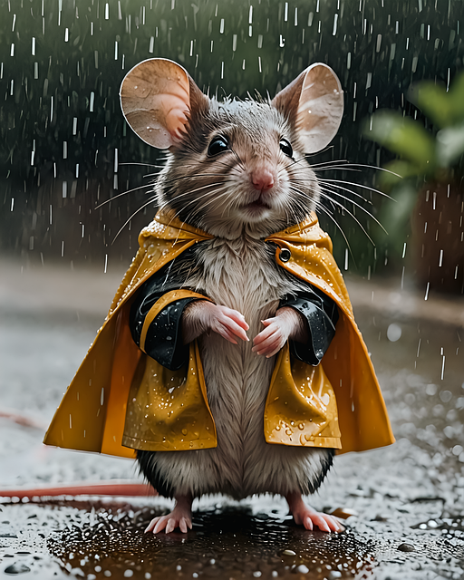 Prints and Posters: ai generated, mouse, rodent, nature, rain, raincoat, cute, raning
