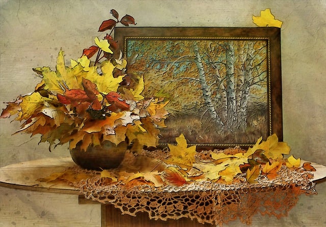 Prints and Posters: autumn leaves, leaves, indoor, frame, painting, artwork, table, digital, photo, manipulation, brown digital, brown table, brown frame, brown leaf, brown painting, brown paint, brown leaves