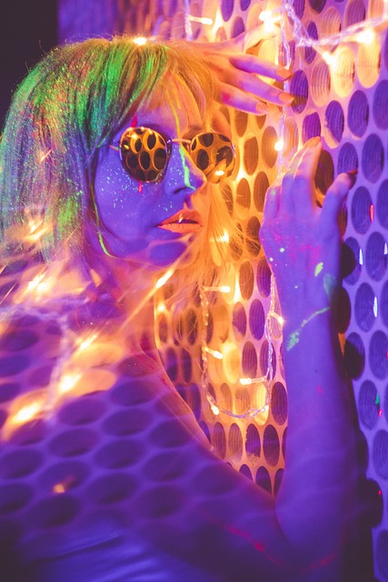 Prints and Posters: body art, neon, young woman, glasses, reflection, lights, flicker, makeup, twilight, a party, get-together, disco