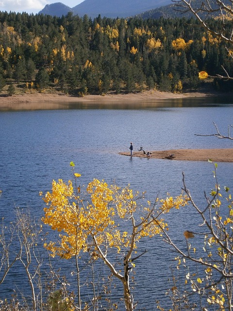 Towels: fishing, lake, trees, forest, human, person, solitary, solitude, conifers, coniferous, conifer forest, mountains, fall, autumn, nature