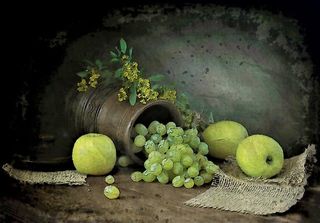 Towels: fruits, grapes, green, vase, table, indoor, digital, art, work, photo, manipulation, healthy, food, sweet