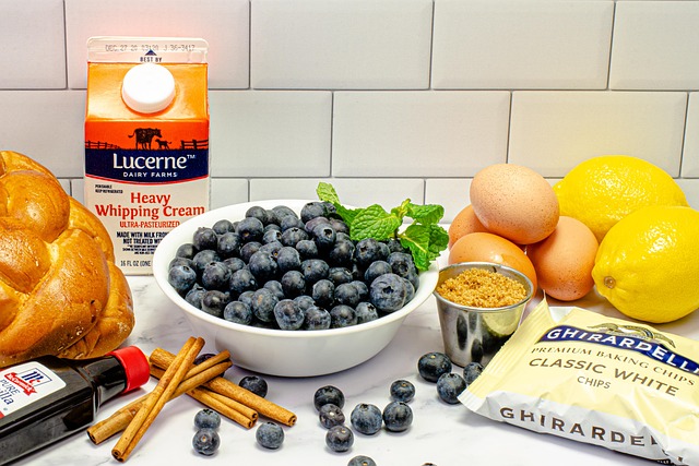 ingredients, baking, bread pudding, bread, blueberry, lemon, fruits, egg, sugar, vanilla, whipped cream, baking chips, cinnamon, cinnamon sticks, sweets, food, dessert