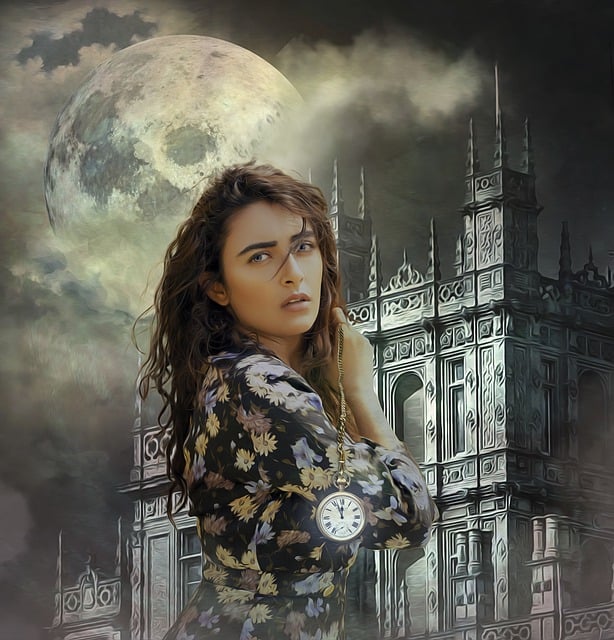 woman, fantasy, time travel, magic, time, watch, lady, castle, cover, female, moon, moonlight, clock, pocket watch, book cover, cover art, avatar, profile picture