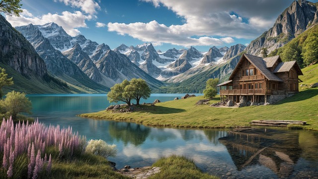ai generated, cabin, landscape, log cabin, home, lake, mountains, rural, scenic, scenery, nature