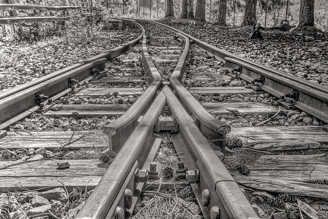 tracks, rails, railroad, railway junction, abandoned, old, metal, rusty, black and white, loneliness