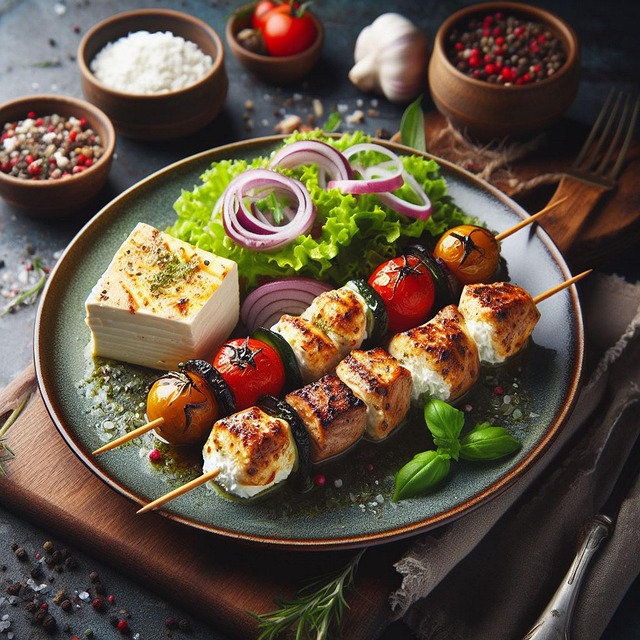 Canvas Prints: ai generated, kebab, kebap, food, dish, skewed, meat, tomatoes, pike, vegetarian, cheese, salad, meal, yummy, grilling
