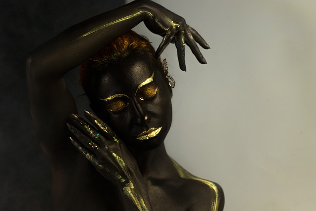 young woman, fashion model, bodypainting, black and white, people, brush, designer, painting, art, artist, black skin, african style, afro, ethnicity, hands, pose, black and gold, smoke, fog, dyeSHARE