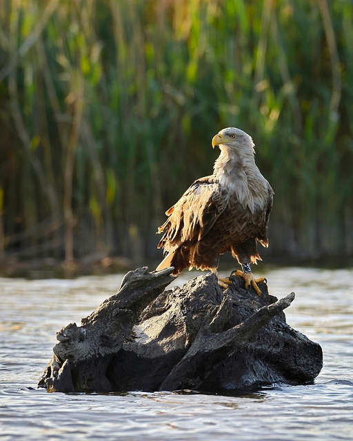 Framed Prints: white-tailed eagle, bird, raptor, animal, wildlife, nature, avian, ornithology, species, eagle, feathers, plumage, river, reed, tree, stump, sunset