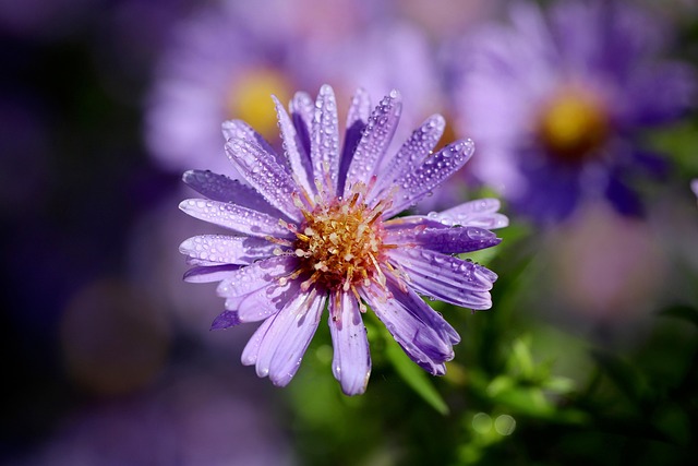 Greeting Cards: aster, smooth leaf aster, dewdrop, virginia aster, waterdrop, new belgian aster, raindrop, symphyotrichum novi-belgii, purple flower, petals, blue blossom