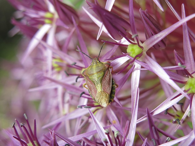 Greeting Cards: bug, insect, flower, allium christophii, tree bug, plant, alium, bulb plant, purple fruit bug, carpocoris purpureipennis, stink bug