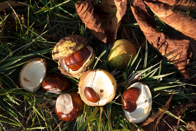 Greeting Cards: chestnut, buckeye, aesculus, fruit, spherical, pear shaped, capsule, seeds, pericarp, smooth, prickly, brown, white, reddish, grass