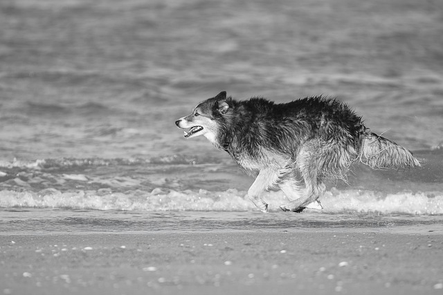 Greeting Cards: dog, wolf, animal, canine, predator, mammal, carnivorous, grey, species, portrait, fauna, nature, beach, sea, waves, sand, side, the water, shore, paradise, ocean