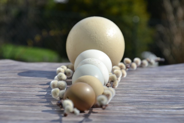 Pillows: ostrich egg, goose egg, putenei, hen's egg, grünlegerei, perlhuhnei, fasanenei, eggs, white, greenish, beige, brown, catkins