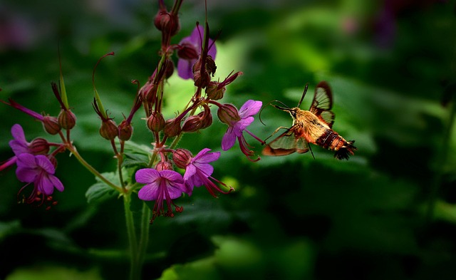 Pillows: sphinx moth, insect, geranium, moth, bigroot geranium, flowers, purple flowers, bloom, plant, garden, nature, closeup