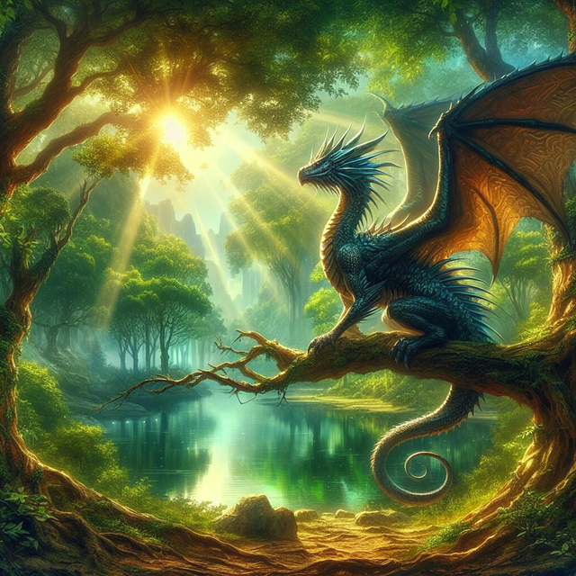 Shower Curtain: dragon, lake, fantasy, nature, beast, animal, forest, sunrays