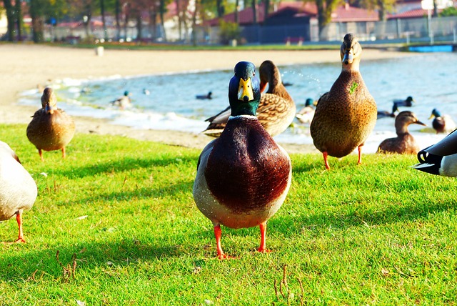 donald duck, water bird, lawn, lake, beach, portrait, animals, nature, outside, vertebrates, closeup, vegetation, green, grass, city beach, grudziądz, color, beautiful, alive, autumn, environment, biologySHARE